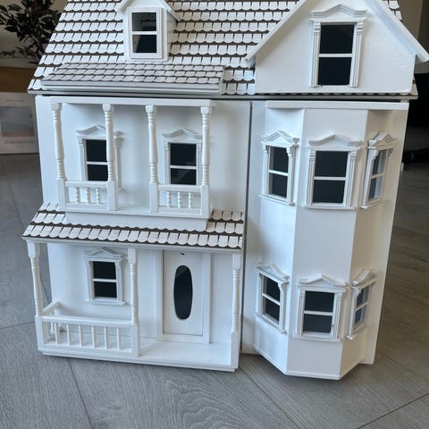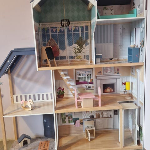 Pent brukt dukkehus med noen bruksmerker. Jeg tror det er Lundeby, men husker dessverre ikke. Diverse innredning følger med. Noen bruksmerker her og der. Og gjerdet i 2. etasje har dessverre løsnet fra limet, men det burde være lett å få på plass igjen med ny lim.