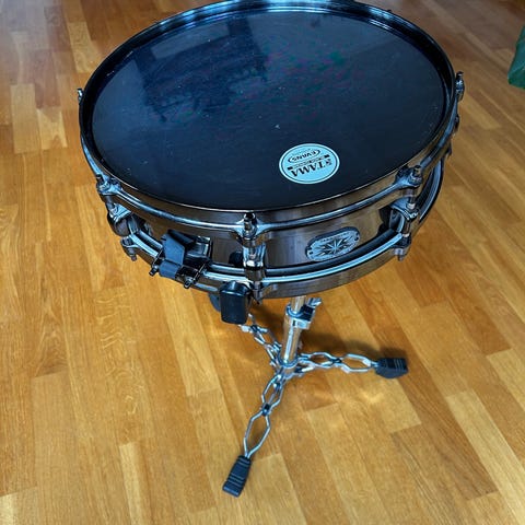 Olympic skarptromme, ukjent alder. Kjøpt på finn, men ikke brukt nok til å beholde. Ingenting er endret ved trommen. Samme skinn og snare.