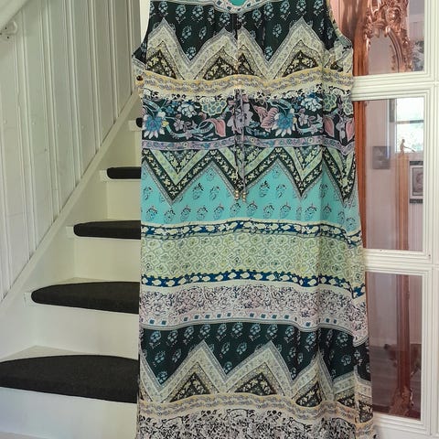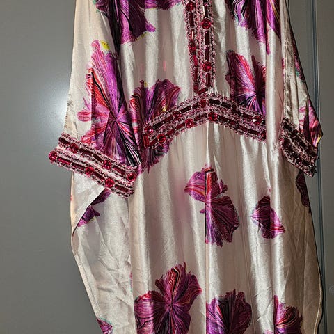 Kaftan i sort og hvit. Merke Monkel.V hals. Snøring under bysten. Lengde ca 138 cm