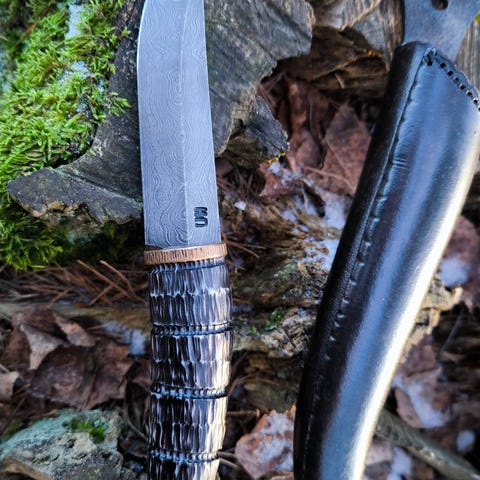 Har aldri vært brukt eller slipt siden den var ny. Knivsmeden Kenneth H er kjent for å bruke lokale råvarer og levere høy kvalitet. Knivsmeden.no