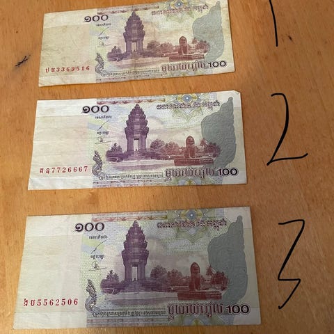 90% rabatt: Cambodsja 2001 100 Riel (Bankfrisk), 2 sedler
