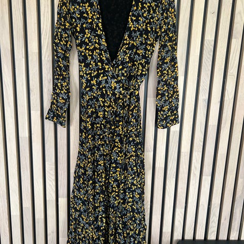 Den er som ny og brukt 3 ganger. Dessverre har jeg klippet av lappene i kjolen som viser størrelsen på den. Men er ganske sikker på at den er størrelse M. Den er ikke Størrelse S.