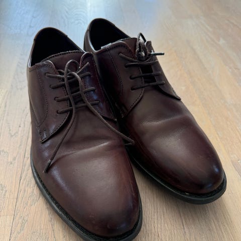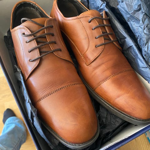 Skoene er brukt kun et par ganger og fremstår som pent brukte, men har noen merker og flekker i læret (se bilder). Såler er i god stand og skoene er fortsatt solide.