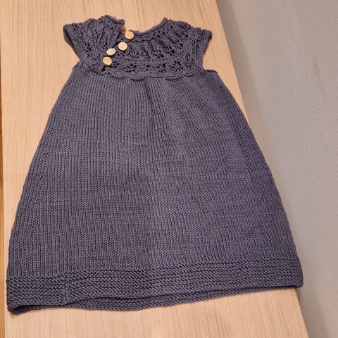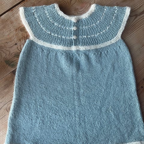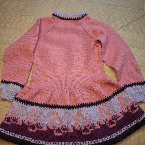 Hjemmestrikket kjole/tunika til jente, passer fra 4-8 år avhengig av størrelsen på barnet og om man vil ha den som en sid kjole og eller etter hvert en tunika.