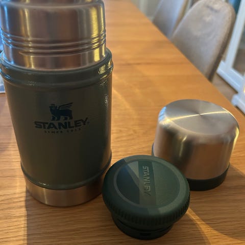 Stanley Classic Bottle Termos med en kapasitet på 1 liter. Fargen er grønn, og den er laget for å holde drikker varme i opptil 24 timer eller kalde i opptil 24 timer. Termosen er også i stand til å holde is i opptil 5 dager. Den har en praktisk håndtak for enkel transport.