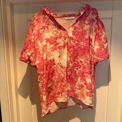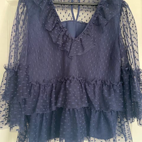 Pent brukt topp i nydelig lyseblå farge og tynt behagelig stoff. Ingen rifter i stoffet, lite brukt da den egentlig er for trang til meg.