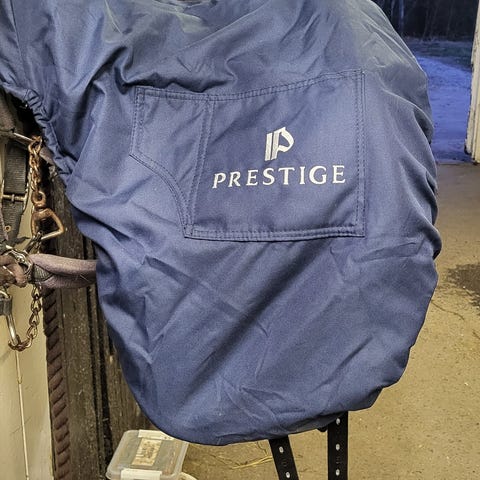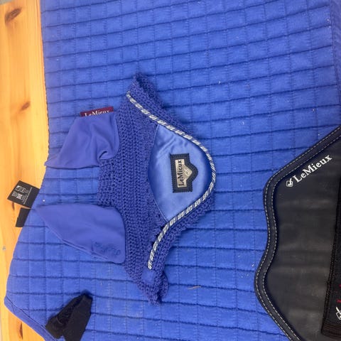 Mørkeblå lemieux sett (sjabrak str S/M, hjelmtrekk og belleg str S) kan selges separat, genser i str xs