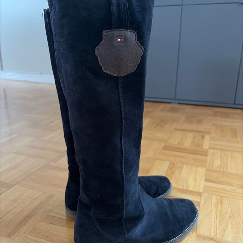 Tommy Hilfiger Boots i størrelse 38. De er laget av blå semsket skinn og har et klassisk design. De er ideelle for både hverdagsbruk og fest
