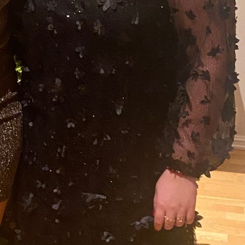 Fransa kjole/tunika i størrelse M og svart farge. Kjolen er ermeløs og har en dekorativ detalj på brystet.