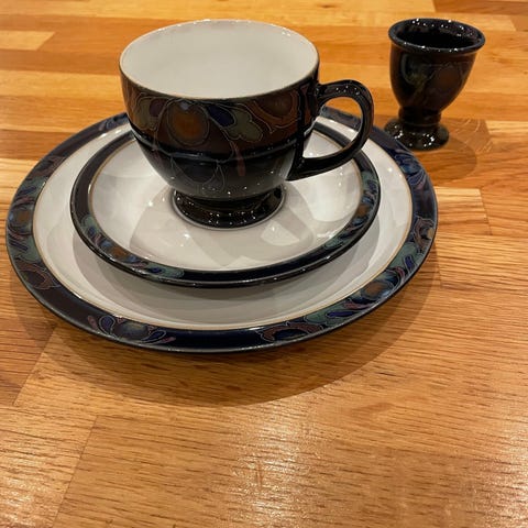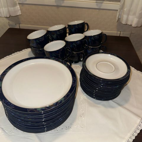 Deler i servise Denby Baroque selges samlet. Servise delene har aldri vært i bruk,har stått i lukket skap for oppbevaring.