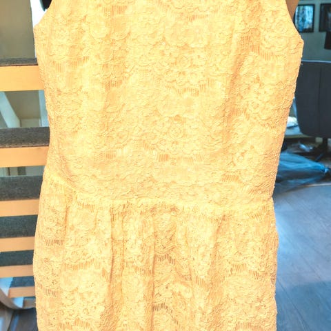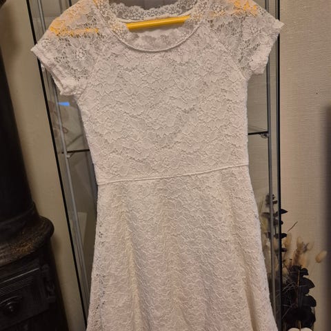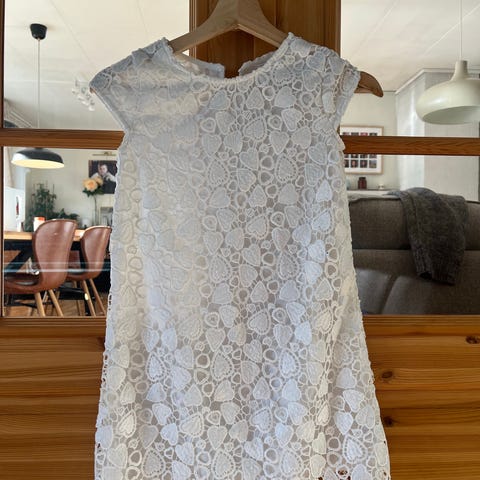 En pent brukt lekker offwhite blondekjole i str 122 (6-7 år). Sitter veldig pent på og kan brukes både til hverdags og pent. Ingen anmerkninger.