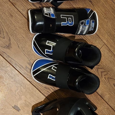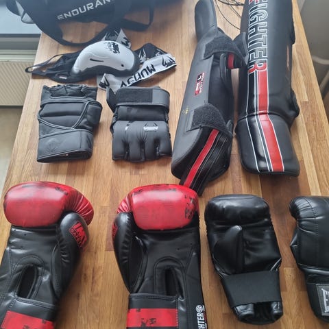 Beskyttelse til kickboksing (eller annen kampsport). Hjelm og leggbeskyttere er i strl M. Boksehansker 12 oz. Usikker på føtter, men jeg bruker generelt 40 og de passer i hvert fall meg :-)