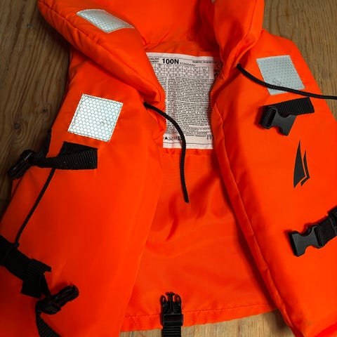 Med glidelås, justerbare midjebånd, greinbånd, fløyte og reflekser.