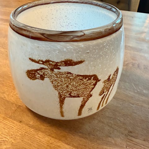 Spesiallaget STOR FLOTT VASE - signert designer P.K.Johnsen - håndlaget nydelig tungt glass og flott farget motiv i grønn/blå toner - "Mette Marit" - 27 cm H - 8 cm i diam. bunn - 16 cm br. oppe - samleobjekt - norsk - made in Norway - oppbevart i glass-skap - ingen bruksmerker Frakt kr.69,- inkl. sporing og forsikring