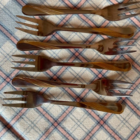 Til 6 personer! Den ene skjeen har mistet en liten bit av skafte ,se bilde! Det er Perlemor imitasjon