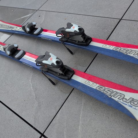 Rossignol junior me alpinski med bindinger. Brukt 2 sesonger. Noe bruksmerker men har mye bruk igjen. Selges da de er blitt for små. God til nybegynner.