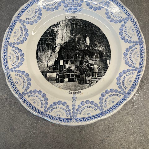 Vakkert sett i nydelige farger. Noe krakelert. Fatet er 34,5cm i diameter, muggen 36cm inkl hank. Signert. Må hentes i Oslo.
