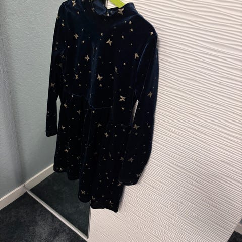Kjole med noe "slep" (kortere foran enn bak) . Utrolig fin på. Str 122 (6-8 år)