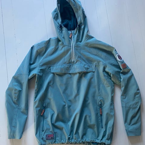 Anorakk selges til 150 da det har blitt en flekk bak, som hetta skjuler. Den er grov i stoffet.