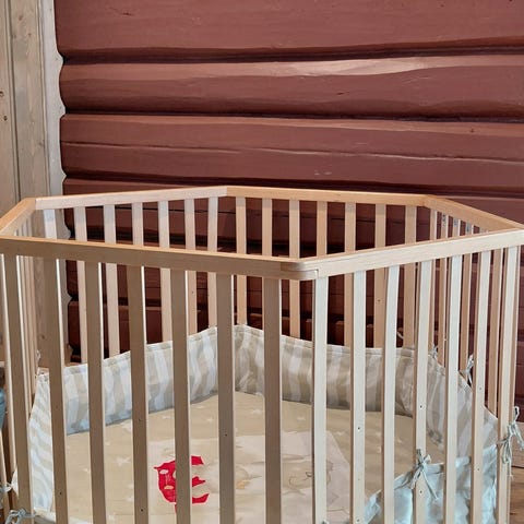 Leikegrind, sammenleggbar, ca 95x97 cm, selges billig pga. at den har vært elska av mange barn, og at den har fått misfarging etter selvklebende borrelås i bunnen (se bilder). Jeg ville nå uansett ha brukt den med et teppe eller noe i bunnen 😉