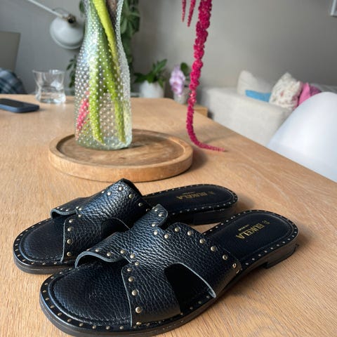 Sorte sandaler, brukt to ganger. Min fot ble for bred for de. Nypris 1600