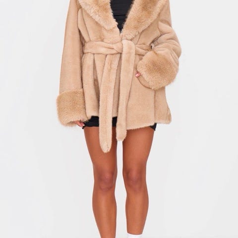 Ny med tags rosa Tyler trench coat med belte, faux fur / fuskepels deler, størrelse small. Kjøpt på Dollskill. Kåpen er litt romslig, mulig den passer en medium også. Nypris 139$ uten taxes