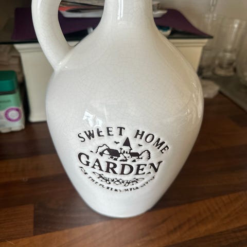 Hvit mugge/vase med påskriften «Sweet home Garden». Litt shabby chic-stil? 24 cm høy. Pent brukt.