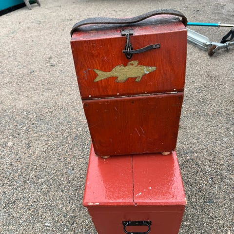 Trekasse fra Askim Meieri med diverse gamle redskaper selges. Se bilder for innhold. Selges samlet for kr 500.-