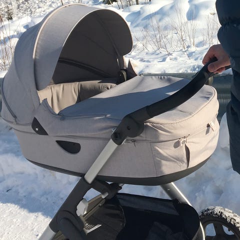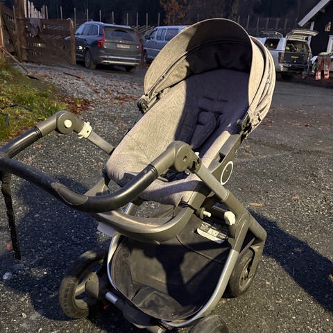 Stokke Trailz barnevogn i grå farge. Barnevognen har en solid ramme og justerbart håndtak for komfortabel bruk. Den er utstyrt med sikkerhetsbelte og romslig oppbevaringskurv under. Perfekt for daglige turer med barn.