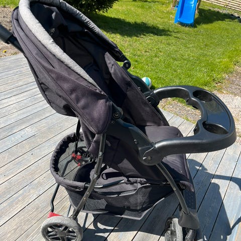 Lett trillevogn som tar liten plass når man slår den sammen. Den er godt brukt, men mye bruk igjen! Den eneste "feilen" er en sprekk i gummien på framsiden, men det er kun kosmetisk. Trekket ble nettopp tatt av og vasket og det tok alt for lang tid før jeg kom på at hele sittedelen kan tas av ramma. Det gjør det enkelt å vaske! Det følger med regntrekk og myggnetting.