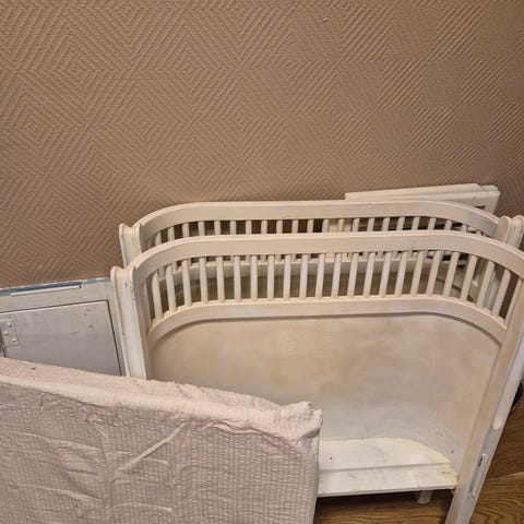 Godt brukt. Fungerer som den skal. Madrass uten merknader kan medfølge. Er slått sammen, må hentes.