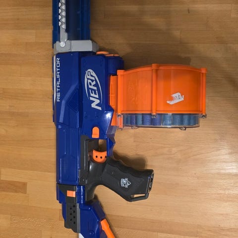 Dette er en nerf rapidstrike som skyter i full auto. Den har nesten nye batterier og har for det meste bare sittet i et skap for det meste. Magasinet holder 18 skudd som også følger med nerfen. Send melding hvis du har spørsmål. Pris kan diskuteres.