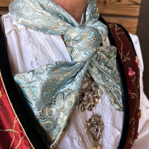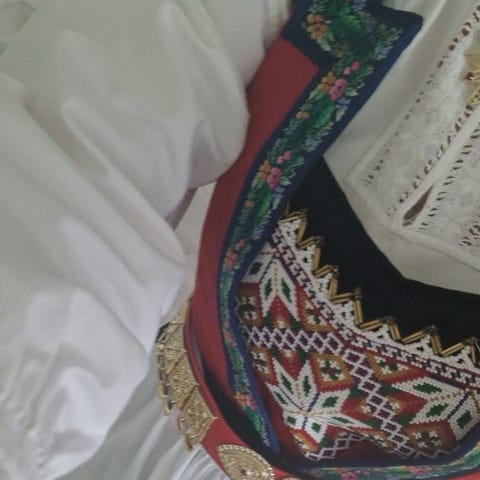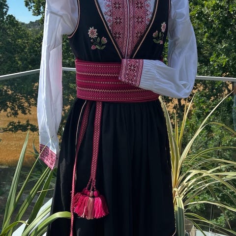 Selges komplett med brikkevevd belte, forklebånd og skjorte.