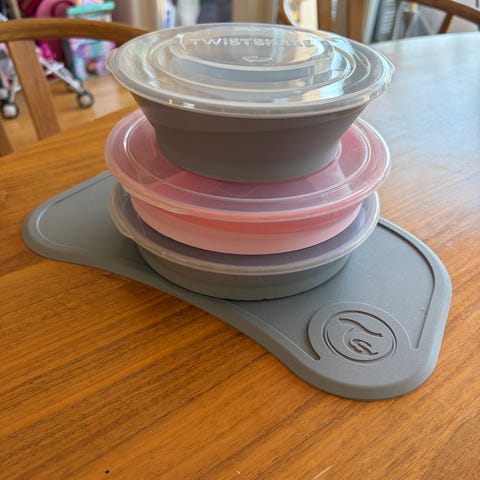 Supersmart servise fra Twistshake. Spisematte som «kleber» seg til bordet, med tre tilhørende tallerkener som kan festes til matten for å unngå unødvendig gris.