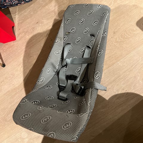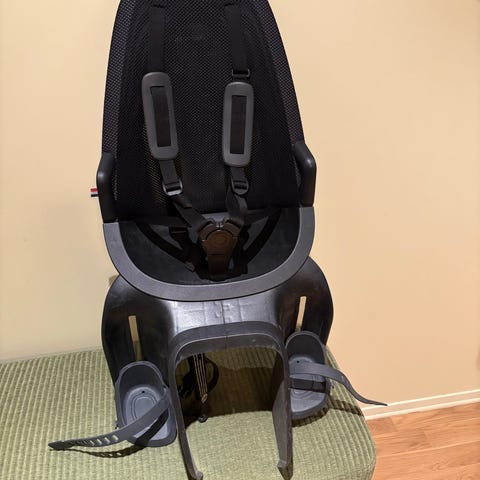 Kjempefint sykkelsete som vi har hatt mye glede av. «Stolen» monteres foran setet (stangen må være litt smal - den passer perfekt på den litt eldre sykkelen på bildet), slik at man sitter med barnet foran seg. Det er så hyggelig å suse gjennom byen mens man ser d t samme og kan snakke om det underveis😊