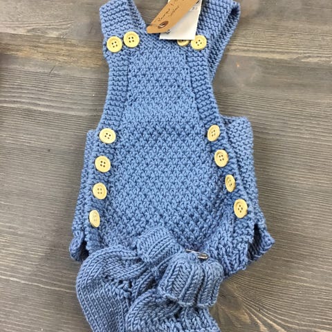 NYstrikket hentesett / romper og sokker i merinoull farge blå tåke. Veldig populært til fotografering og barselgave. Kan sendes i posten. Andre farger og størrelser kan bestilles. Romper kr 390, sokker med knapper kr 230 og votter kr 220; totalt kr 840.