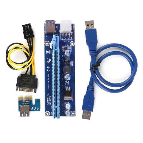 4 x PCI-E riser card 1x to 16x extender with USB 3.0 cable, MOLEX SATA cable. Pris per stk. 150 NOK.