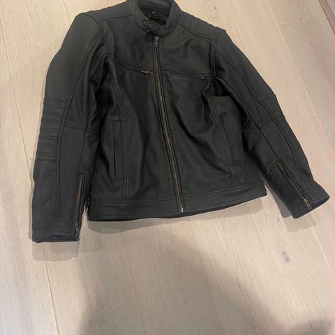 Pent brukt herrejakke uten synlig slitasje eller mangler. Jakken har beskyttelse på skuldre og albuer og det følger med ryggplate. Jakken er i sort skinn og har stretch på underarm og sidene som sikrer en behagelig kjøreopplevelse. Kan sendes eller hentes.