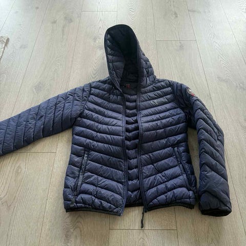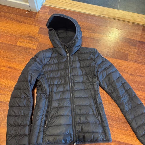 Superfin boblejakke (tynn). Nesten ikke brukt. Glidelås foran. Hette som kan snurpes. Lett jakke som varmer godt. Blå-lilla farge med glans.