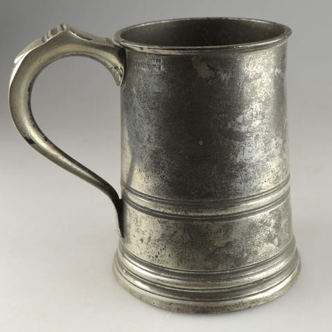 Britisk tinnkrus med spilledåse i bunnen
