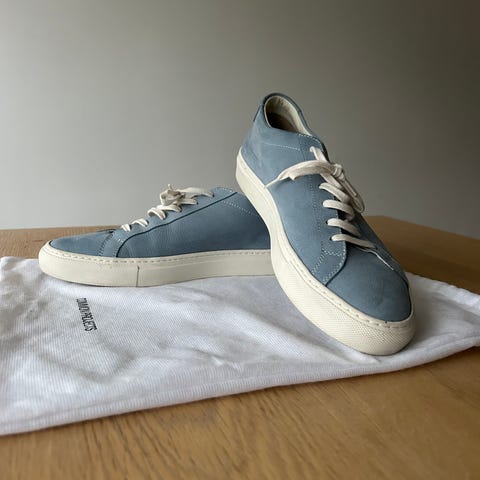 Selger et par pent brukte sneakers fra Common Projects. Modellen heter Achilles Low. Fresh gullfarge som fungerer like bra til jeans og t-skjorte som til en mer dresset stil. Fantastiske sko som ikke blir brukt nok da jeg har andre farger og modeller. Nypris 4700 kr. Str 41 - men sitter som en klokkeren 42 (Common Projects er alltid store i str).