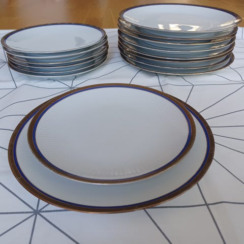 Sju suppeskåler, sju mellomstore tallerkener, et stort rundt serveringsfat og en serveringsskål til salgs. Noen små bruksmerker