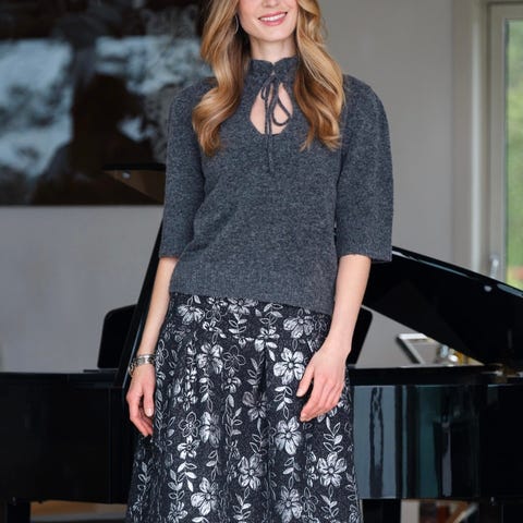 Ane Mone presenterer dette elegante skjørtet i svart og hvit striper. Skjørtet har lommer og glidelåslukking bak. Det er tilhørenede jakke i en annen anonse men jeg tenker denne er finest med en hvit bluse eller sort høyhalset genser. Skjørtet er litt stort i størrelsen, så dette vil nok passe både 42 og 44.