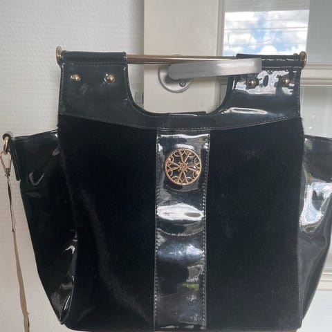 Grønn veske. Med snor så man kan velge om den skal være skulderveske eller håndveske, se bilde. Innerstoffet har løsnet, men fungerer fortsatt fint. Kan nok limes på igjen om ønskelig.