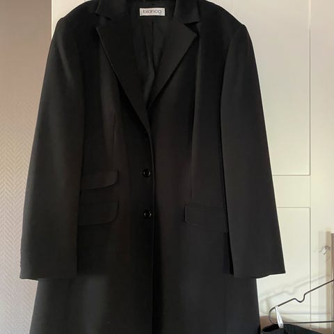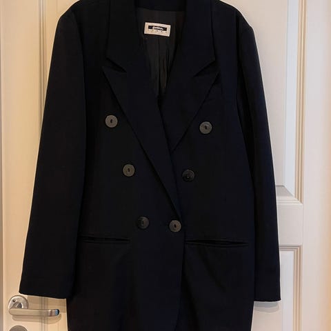 Mørkeblå blazer, str. 38 - ull og polyester blanding. Dobbelt spent.
