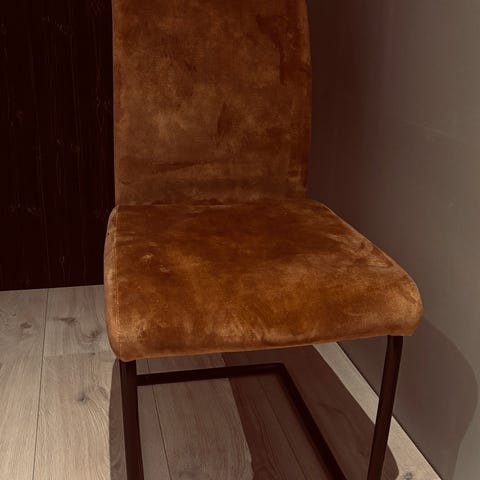 Stolene er trukket i mykt velour-lignende stoff i brungrå farge, med behagelig sittekomfort og stabile metallrammer.
