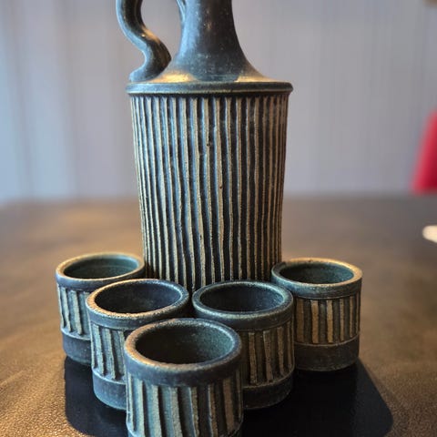 Har stått til pynt, men aldri vært brukt til å drikke av. De er relativt tykke og ugjevne, med personlighet og sjarm. Selges pga. flytting.