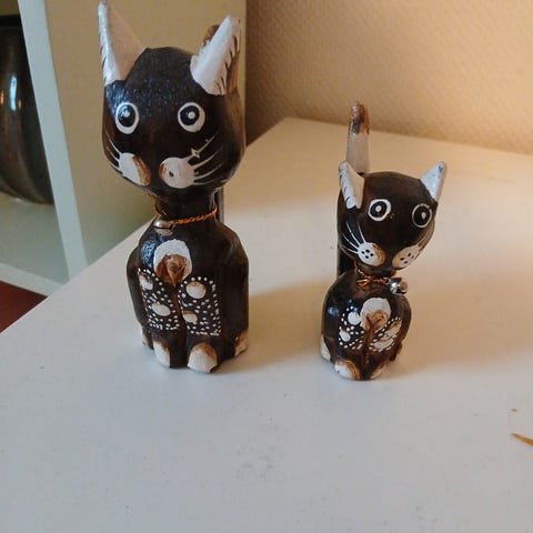 Tre små katter i keramikk, alle med «sukkerglasur». Den i midten fremstår som i best kvalitet og penest, de to andre har et par små skår på blomstene som jeg ser, men de gjør seg fortsatt fint til pynt. Prisen er for alle samlet.