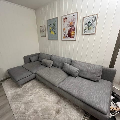 IKEA Söderhamn sofa og puff fra 2022 uten trekk selges billig. Selve sofaen er i god stand men trekket er skadet. Selges derfor uten trekk, så du kan velge trekk fra IKEA eller for eksempel Bemz selv. Oppsettet er som på det første bildet, i tillegg til puff.