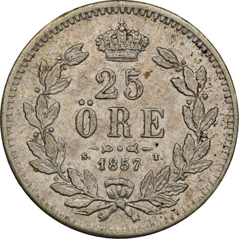 Svensk mynt fra 1856, 25 øre, laget av 75% sølv. Mynten har et design med en krone og eikekrans på den ene siden, og portrett av kong Oscar på den andre siden. Denne mynten er en del av Sveriges historiske valuta.